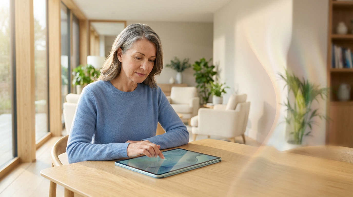 Femme d'âge mûr aux cheveux gris, en pull bleu, naviguant sur une tablette dans un intérieur moderne et lumineux.