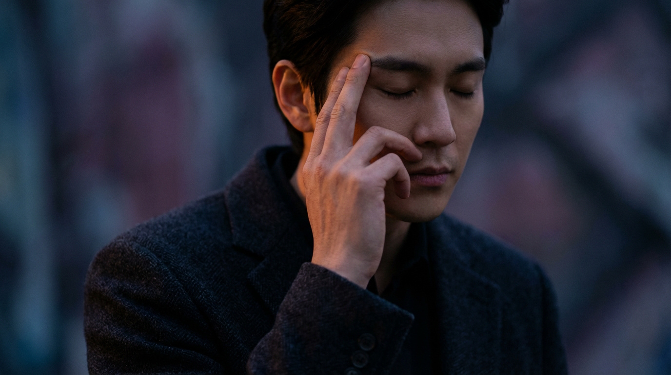 Homme aux yeux clos, visage pensif ou douloureux, pressant sa tempe droite de deux doigts. Lumière chaude sur sa main.
