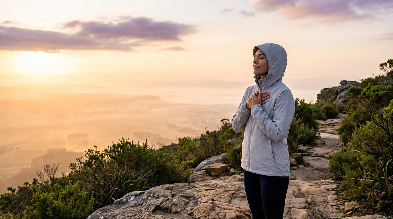 Femme en blouson gris, mains sur la poitrine et yeux clos, méditant sur un sentier de montagne. Lever de soleil brumeux en arrière-plan.